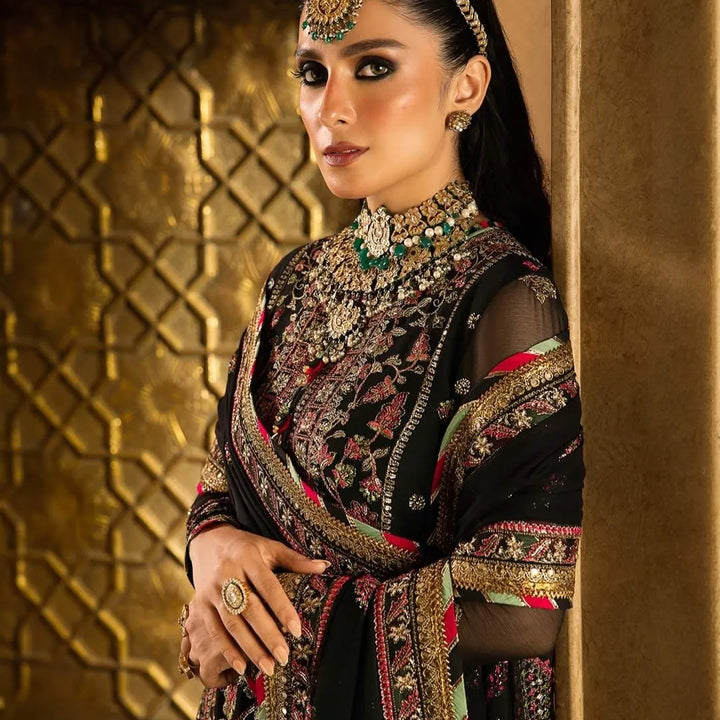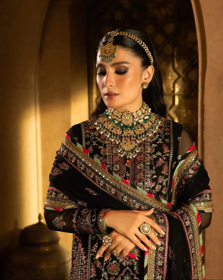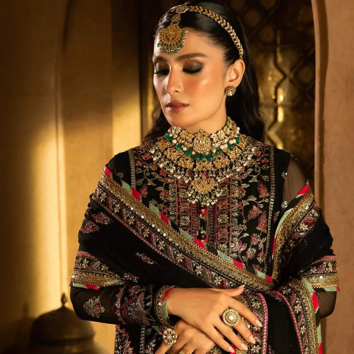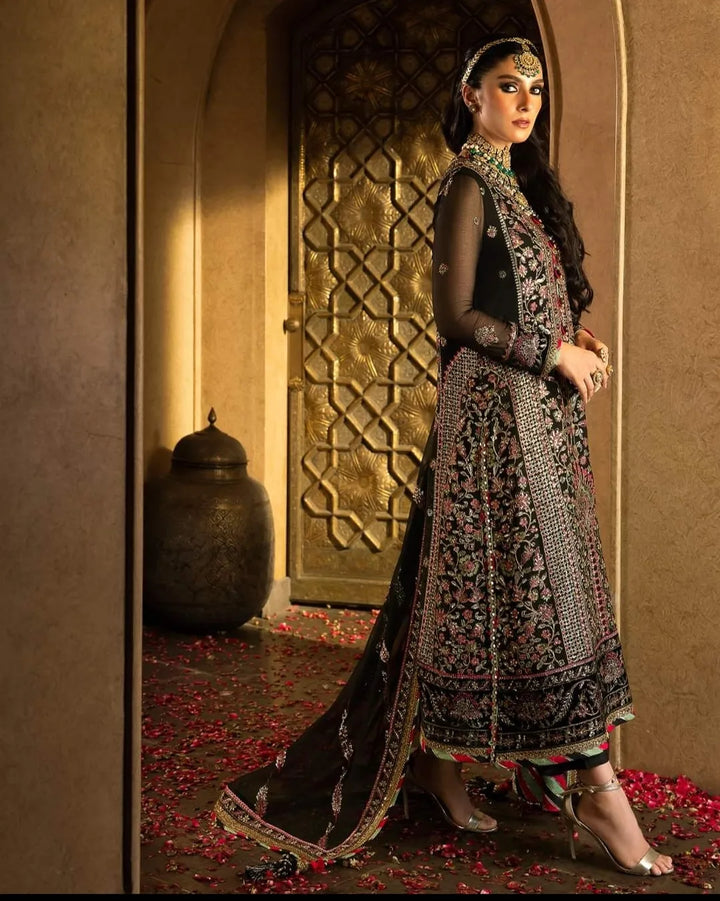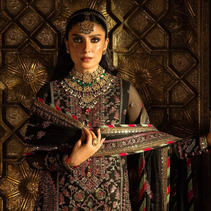 In a captivating dance of colors and motifs, this onyx elite ensemble unfolds like a love story waiting to be told. It's a masterpiece embroidered with intricate motifs, where threads of gold are echoing the ancient art of Meenakari. These motifs breathe life into the attire, a tribute to the rich flora and fauna of South Asia, painting a vivid picture of nature's abundance. The shirt and dupatta, born of the same fabric, share a secret world adorned with delicate cupped sequins, zari, and threads in the hues of magenta and green. The borders of the hem, sleeves, and shirt, cloaked in sumptuous velvet, bring an element of elegance and contrast, like a bittersweet twist in a beautiful tale.