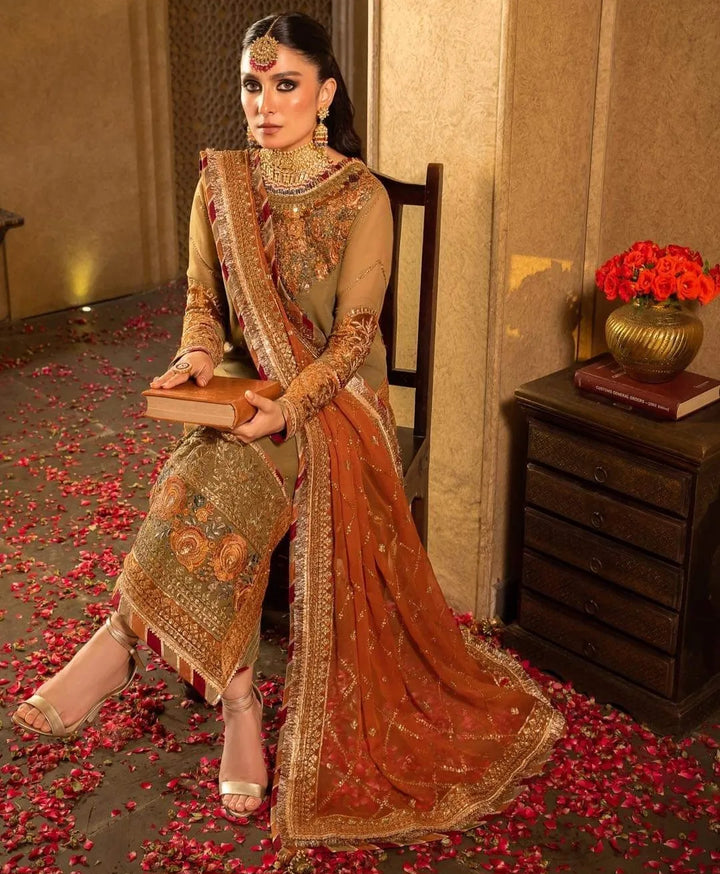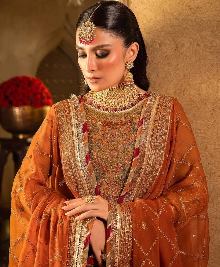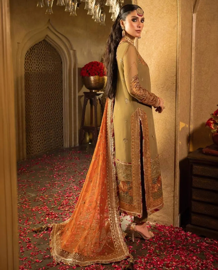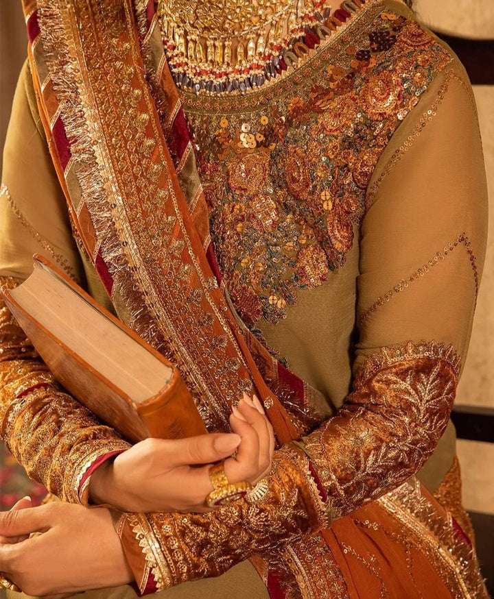 Embrace a world of timeless grandeur with this olive-green ensemble graced by a bronze hued dupatta, a true gem from Asim Jofa's “Velvet Festive Collection”. The fabric tells a tale of opulence adorned with intricate antique gold and Indian gold zariwork embroidery with the additional charm of dual sequins in 7mm and 3mm shimmering in the hues of bronze. The motifs reminiscent of the artistry found in Tanjore painting are a work of art with threads in shades of light and dark rust, maroon, and green weaving a vivid tapestry of creativity. The chaak of the shirt, the daman, sleeves, and bunches are adorned in rust-colored velvet casting a majestic spell and a striking contrast like a dream painted on velvet canvas.