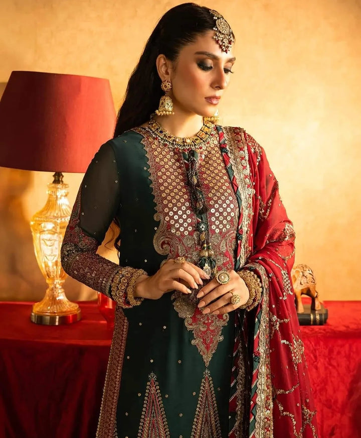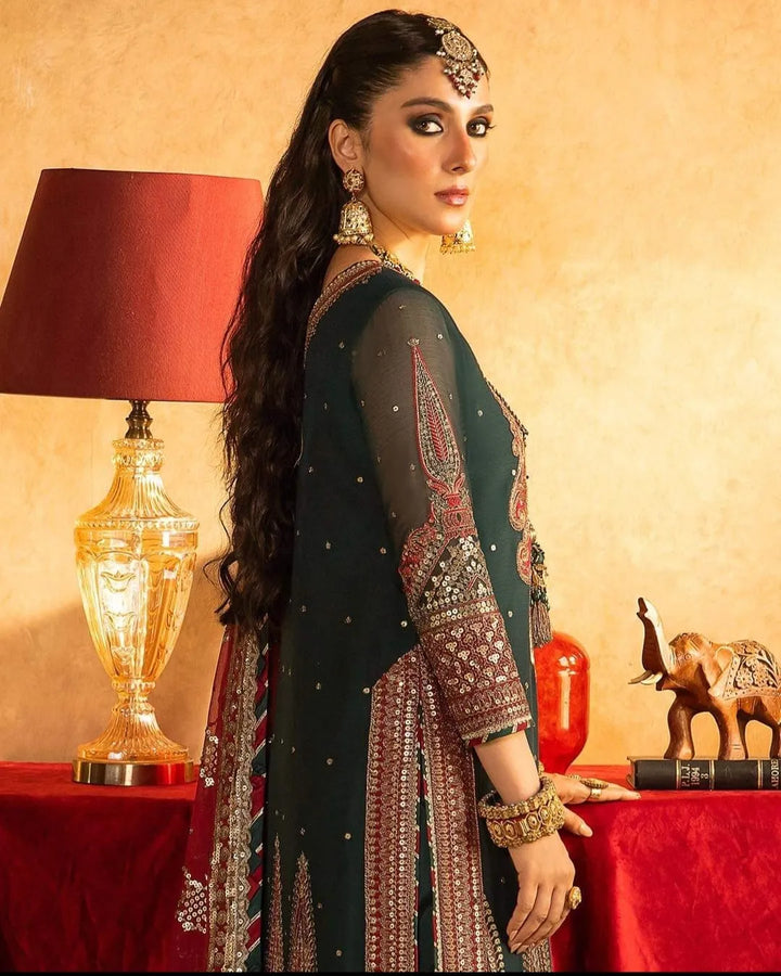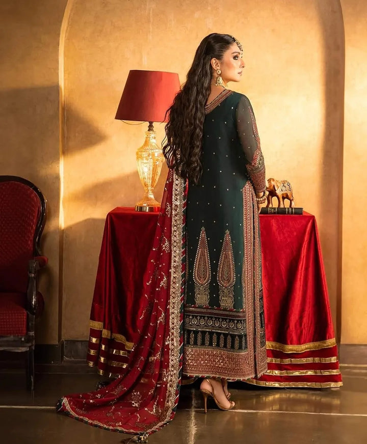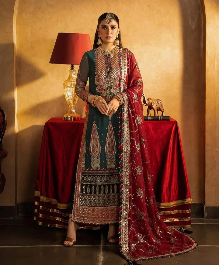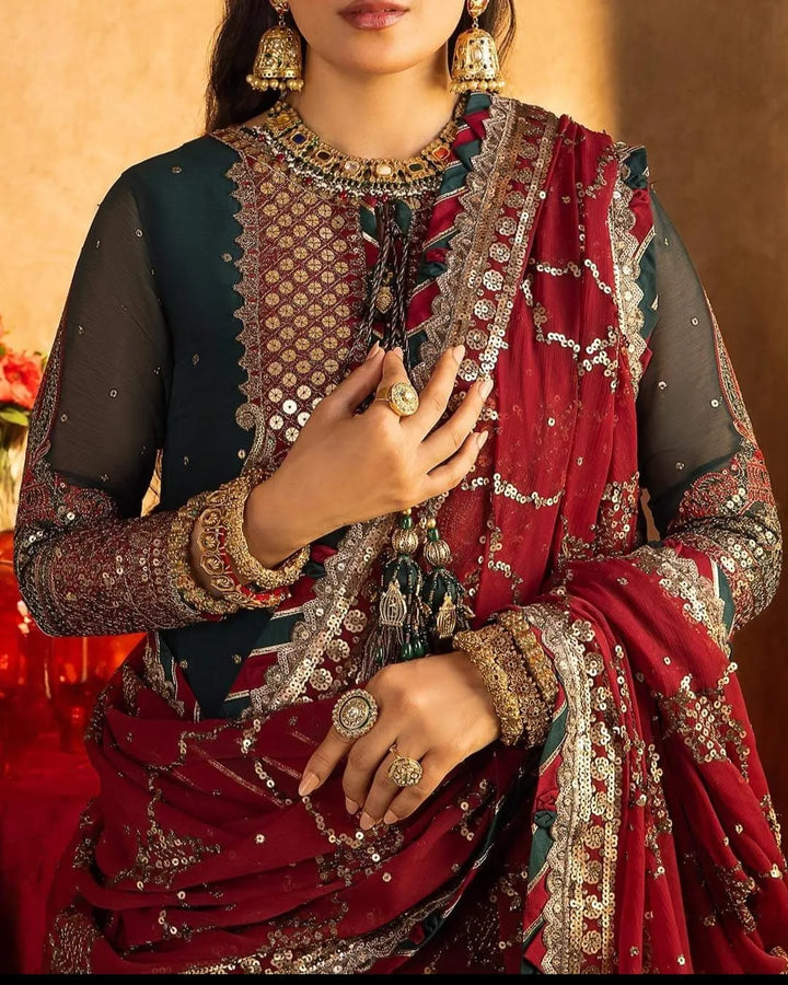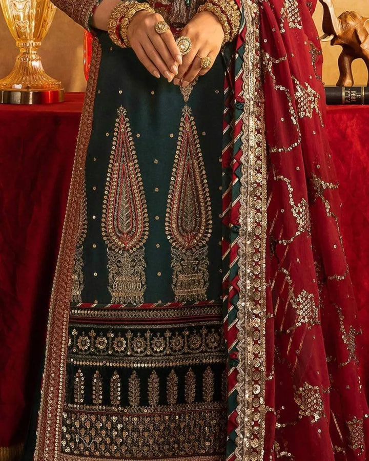 Embrace an unparalleled charm and a gentle grace with this captivating creation, designed in a rich palette of dark green and maroon. The dense shimmering borders and the majestic ethnic motifs that adorn the fabric make it an enchanting piece of art. The outfit features intricate antique gold two-toned zariwork, complemented by maroon threadwork and embellished with matte gold 9mm and 5mm sequins resulting in a design that shimmers and dazzles. The accompanying dupatta is a mirror image of ethnic charm boasting the same intricate embroidery and sequin work as the outfit ensuring that the elegance is carried throughout your ensemble.