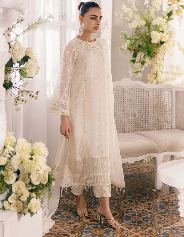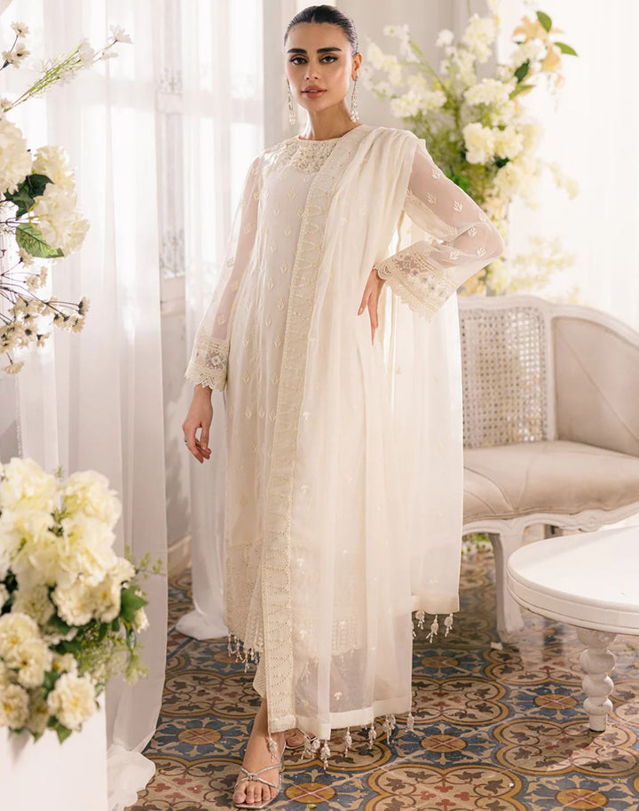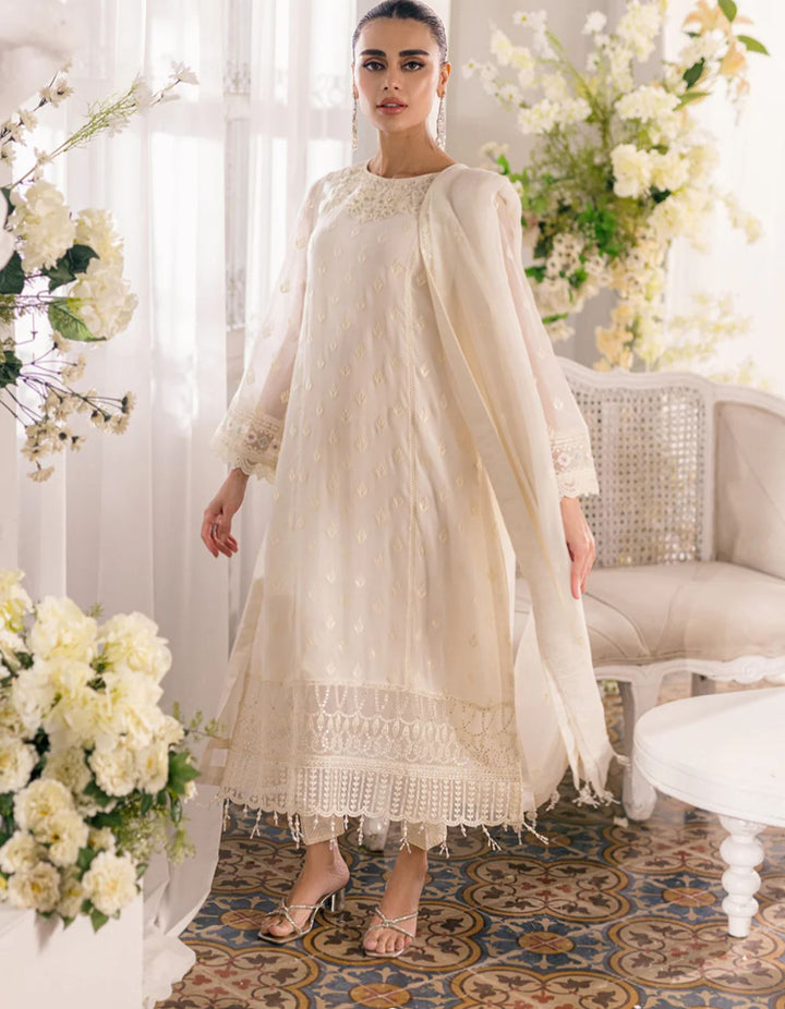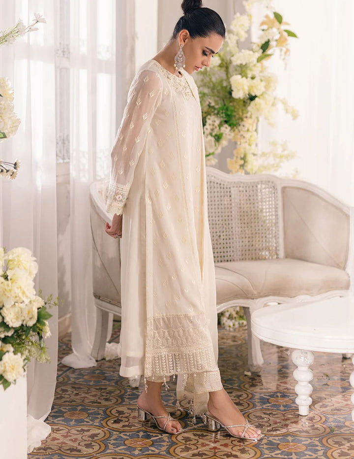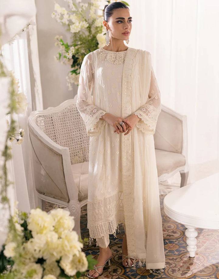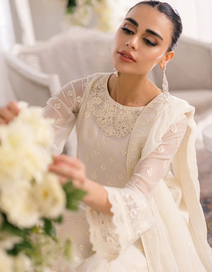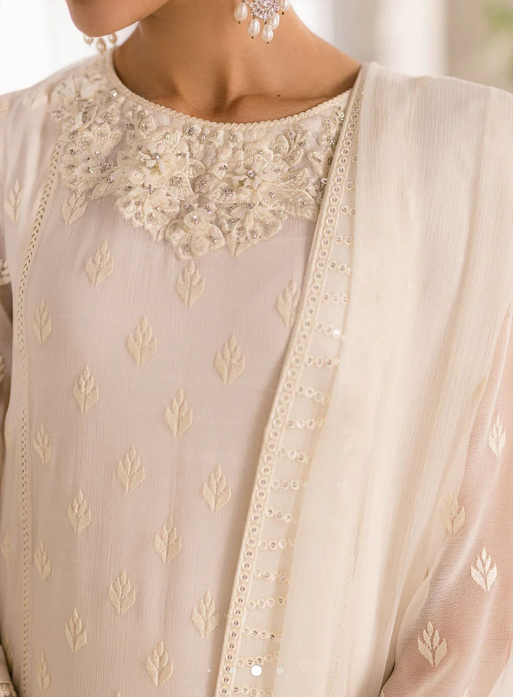 Angelic Frost" graces an off-white canvas with ethereal beauty. The sequin-embroidered chiffon shirt features a handcrafted neck adorned with a delicate combination of sequins and pearls. Organza borders on the sleeves and daman further enhance the look. Paired effortlessly with raw silk bottoms enriched with an embroidered hem, the ensemble is elegantly completed by a minimally embellished chiffon dupatta. This dress radiates a timeless charm, blending intricate craftsmanship with the purity of off-white, creating an enchanting presence. Shirt Fabric: Chiffon Dupatta Fabric: Chiffon Trouser Fabric: Raw Silk