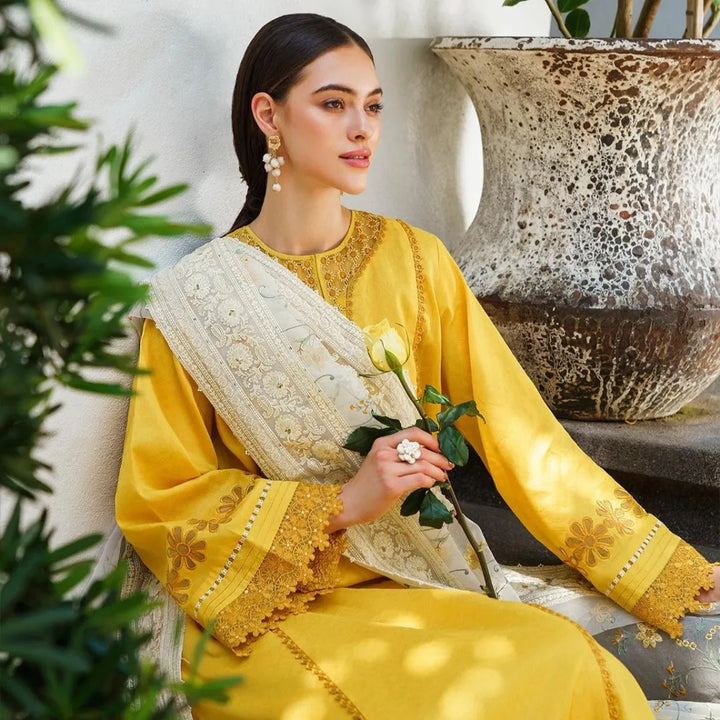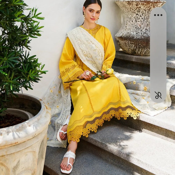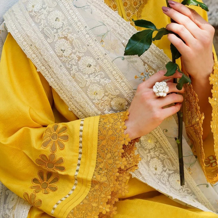This shirt features a dyed self jacquard pattern, organza neckline patch, and embroidered organza details on the sleeves, front border, and dupatta. The dyed cotton trousers add a touch of sophistication to this stunning outfit.