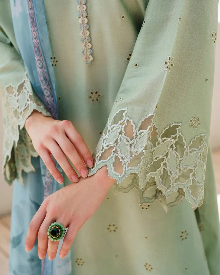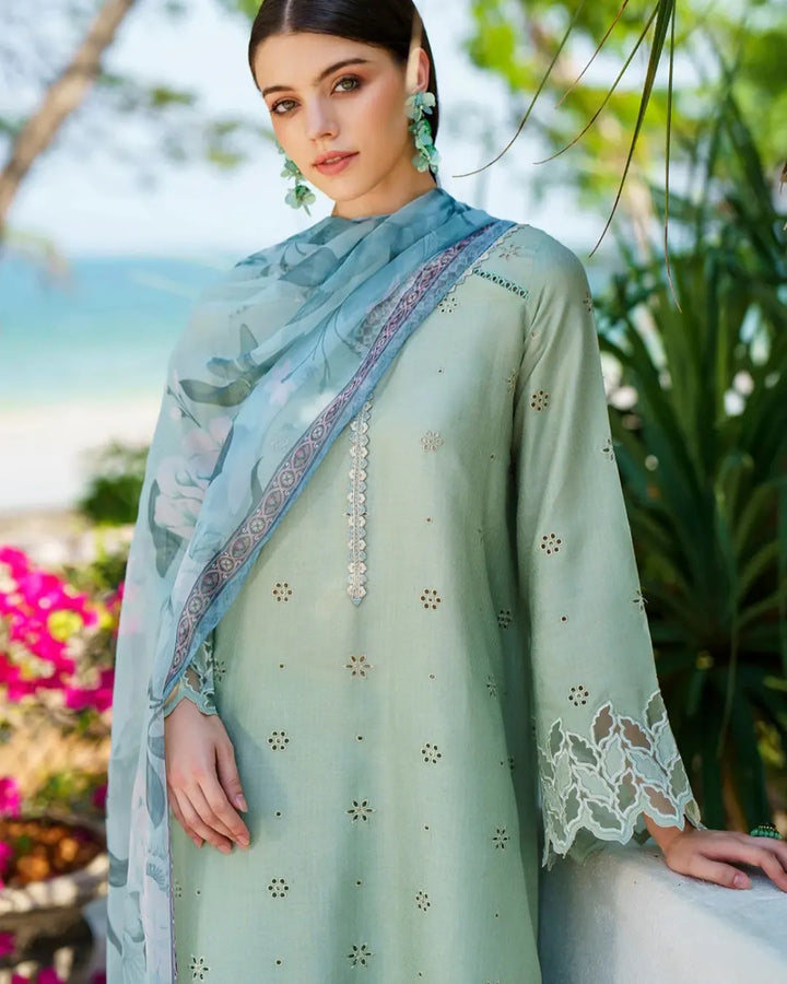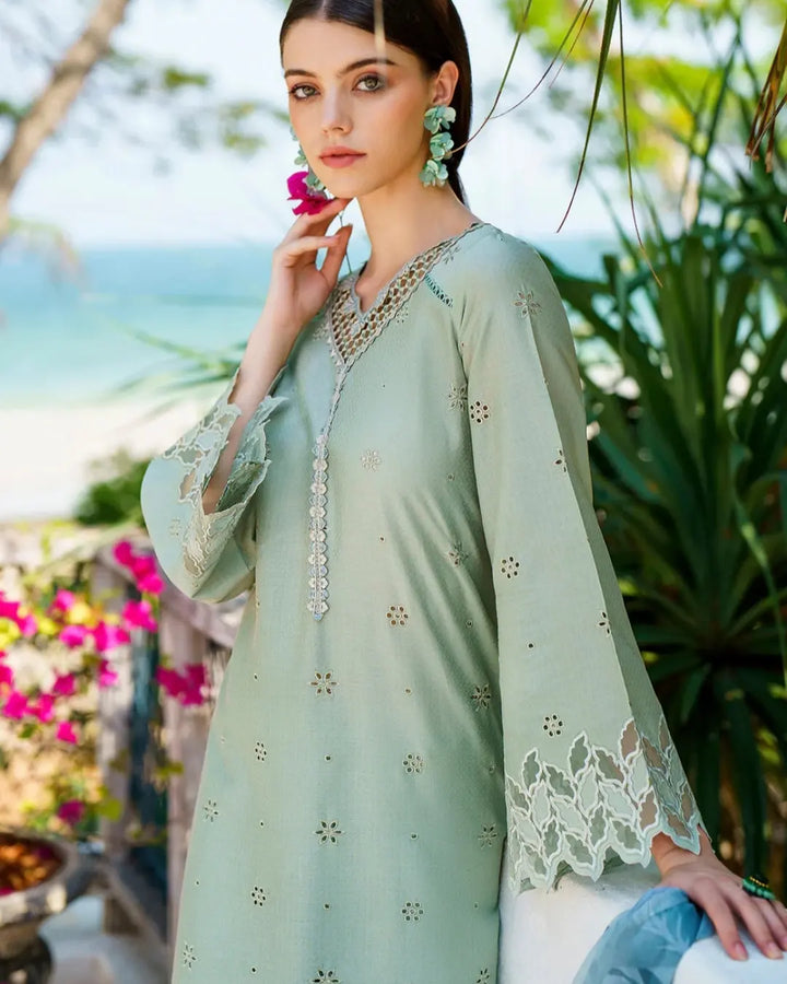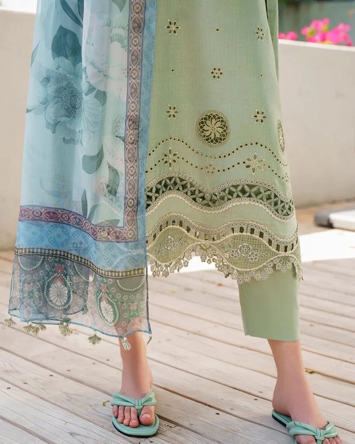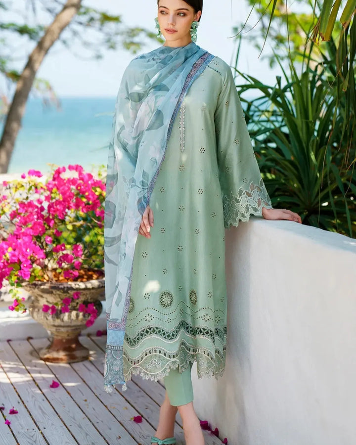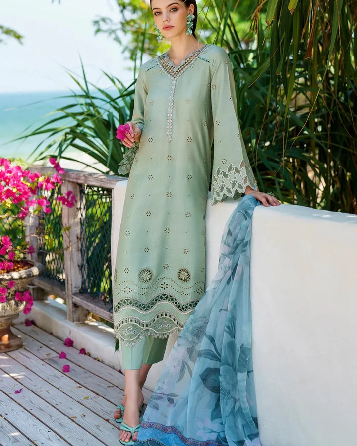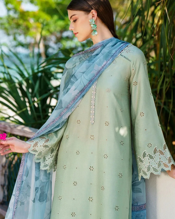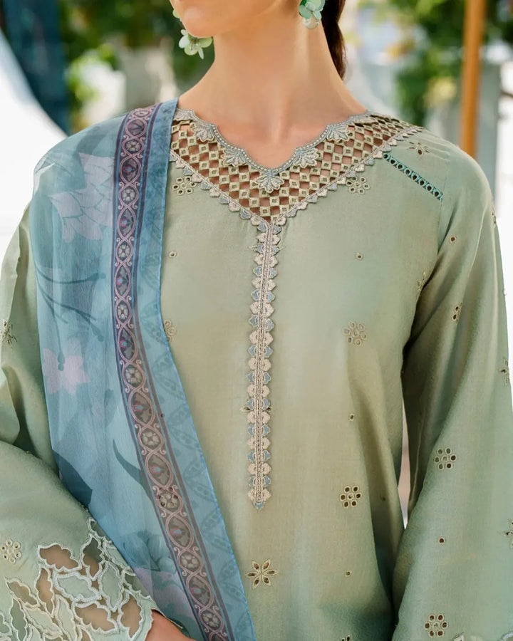 This product features embroidered details on the jacquard lawn front and sleeves, as well as on the organza front, back border, and sleeves border. The back is plain, and it also includes a digital printed chiffon dupatta.