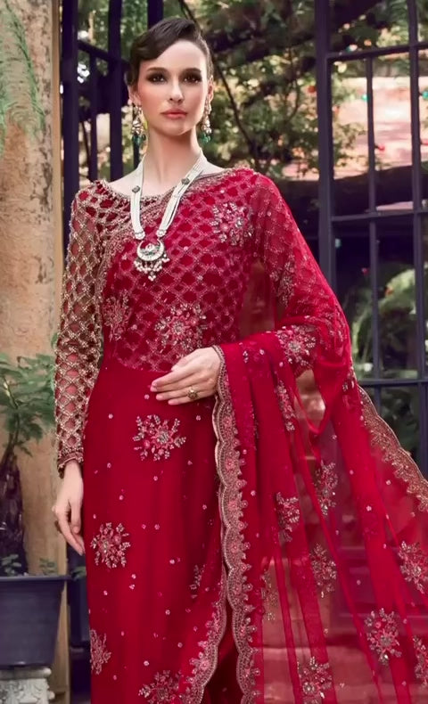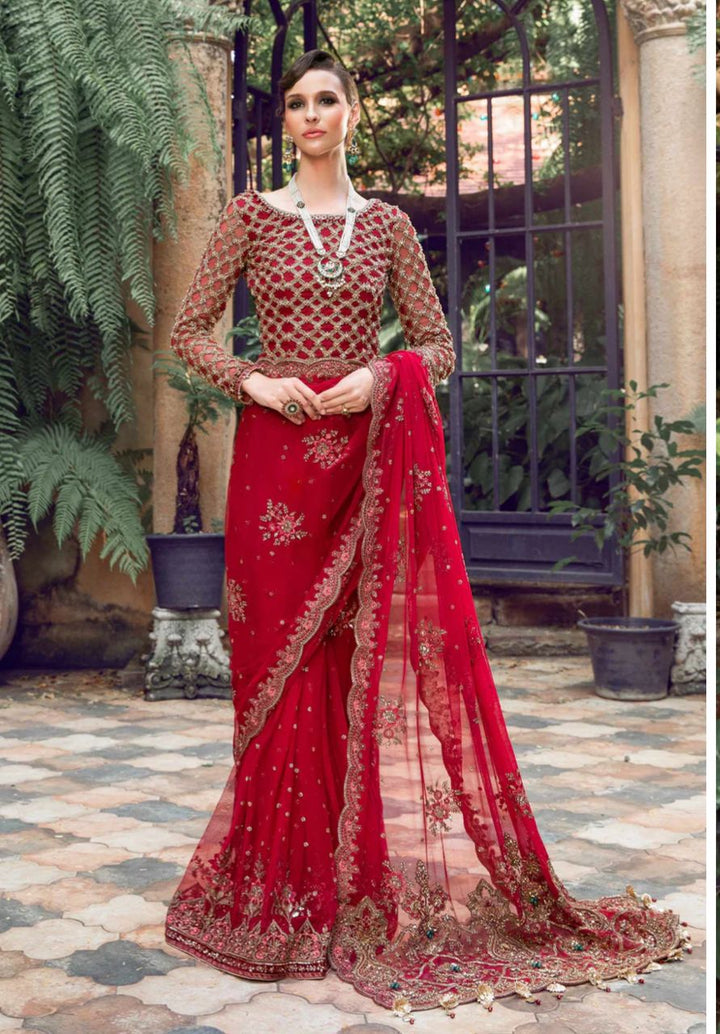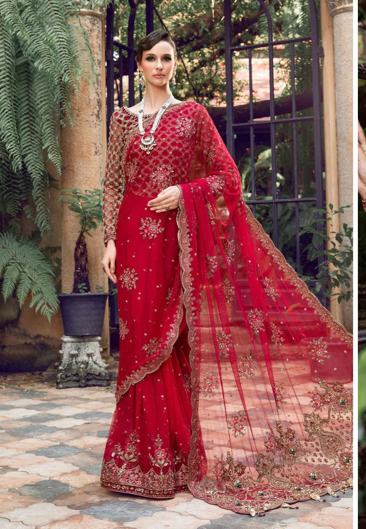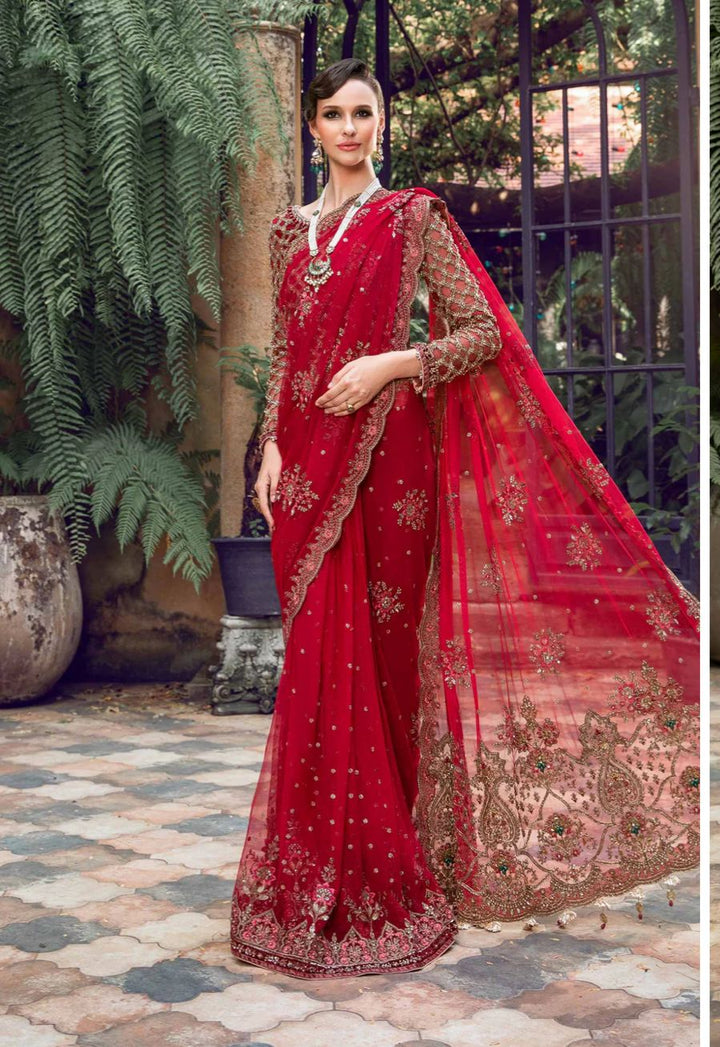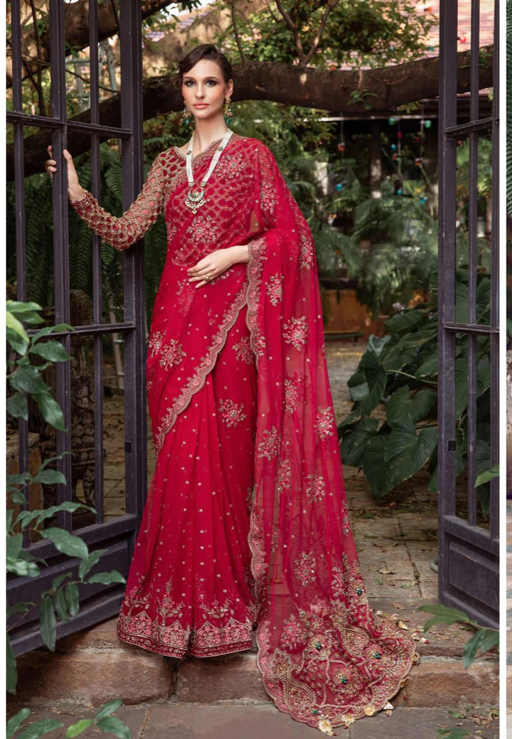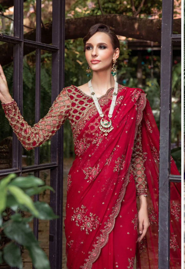 Adorned with blooming floral patterns interwine on a rich red canvas, this awe-inspiring saree is enhanced by a supremely crafted heavy border and hand made gota tassels. The blouse features an intricate jaal spread gracefully extending across the sleeves making it a stellar piece.