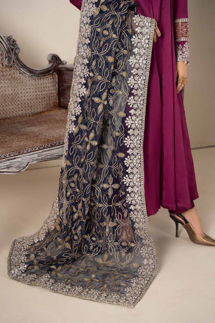 Long frock with embroidered sleeves and fabricated buttons on neckline , matching straight trouser with contrast embroidered dupatta