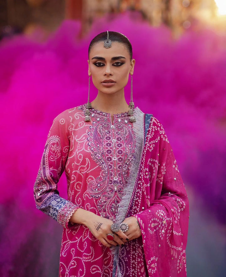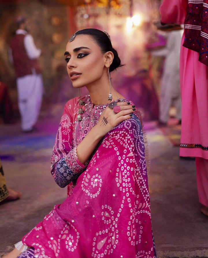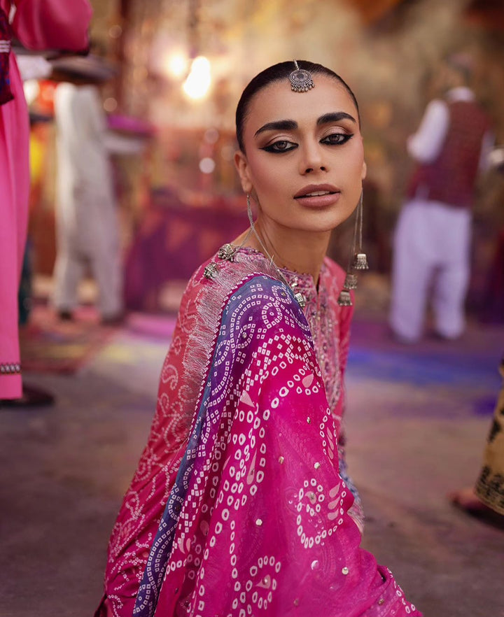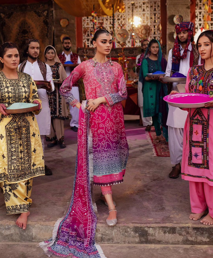 As the nureh girl steps into the city of cultural mix she glams up in the traditional printed dresses styled with blingy mukesh work chunri dupattas. Featuring exquisite designs this festive season.