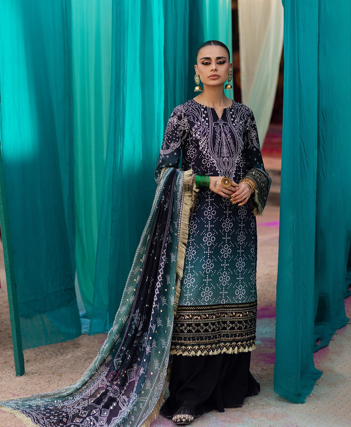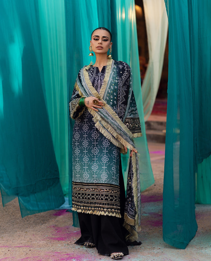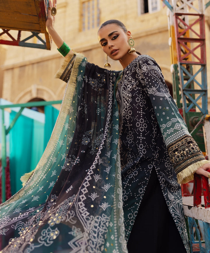 As the nureh girl steps into the city of cultural mix she glams up in the traditional printed dresses styled with blingy mukesh work chunri dupattas. Featuring exquisite designs this festive season.