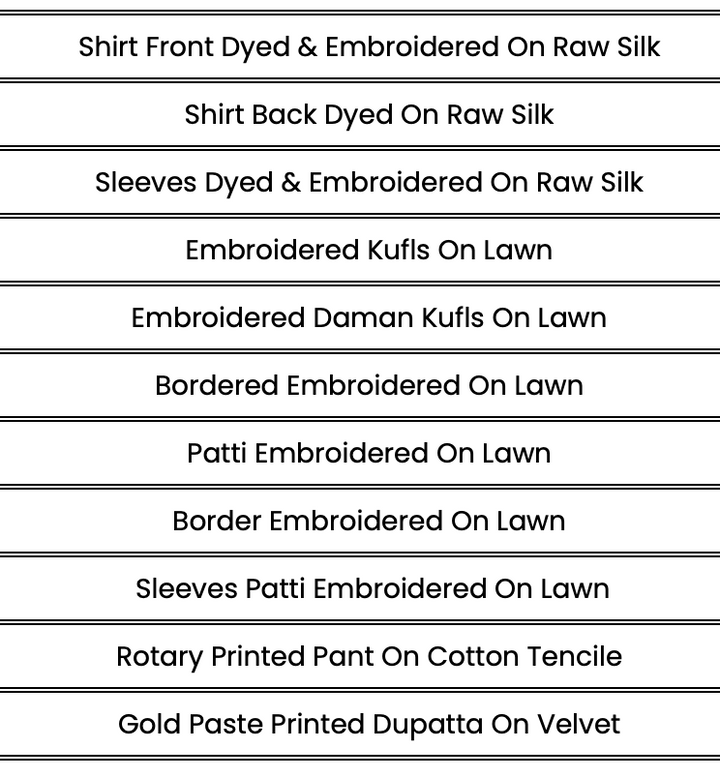 Adorned with Moroccan-inspired kacha tanka embroidery, this captivating ensemble weaves a mesmerizing narrative. It finds its perfect complement in a sumptuous gold paste printed velvet drape and a contrasting rotary-printed pant, creating a dreamy ensemble, perfect for the approaching season.