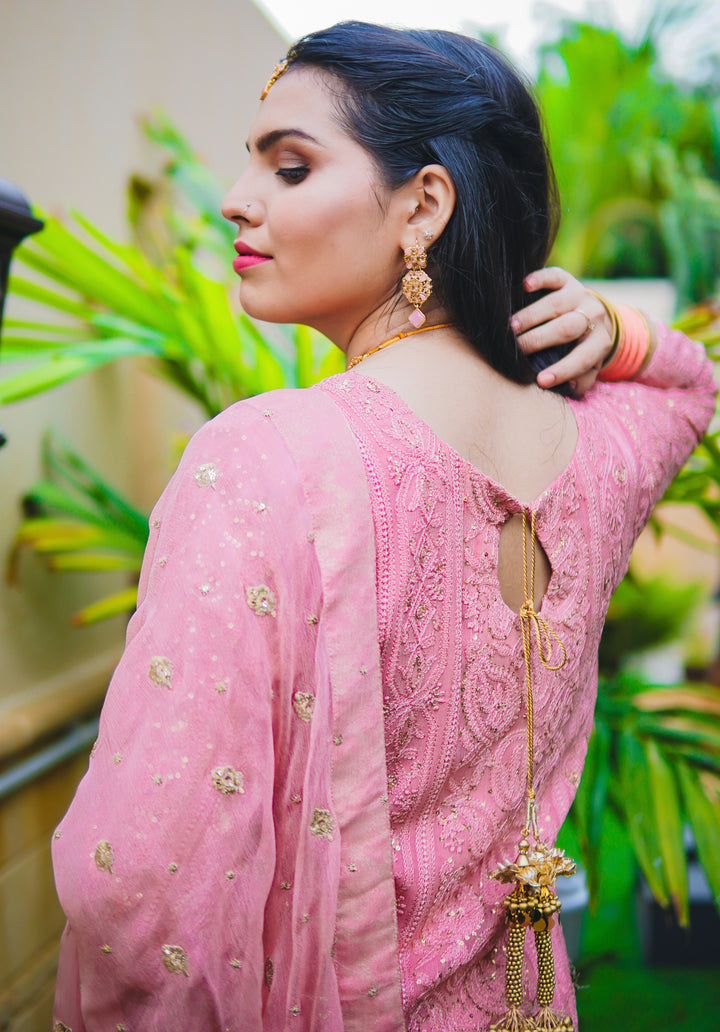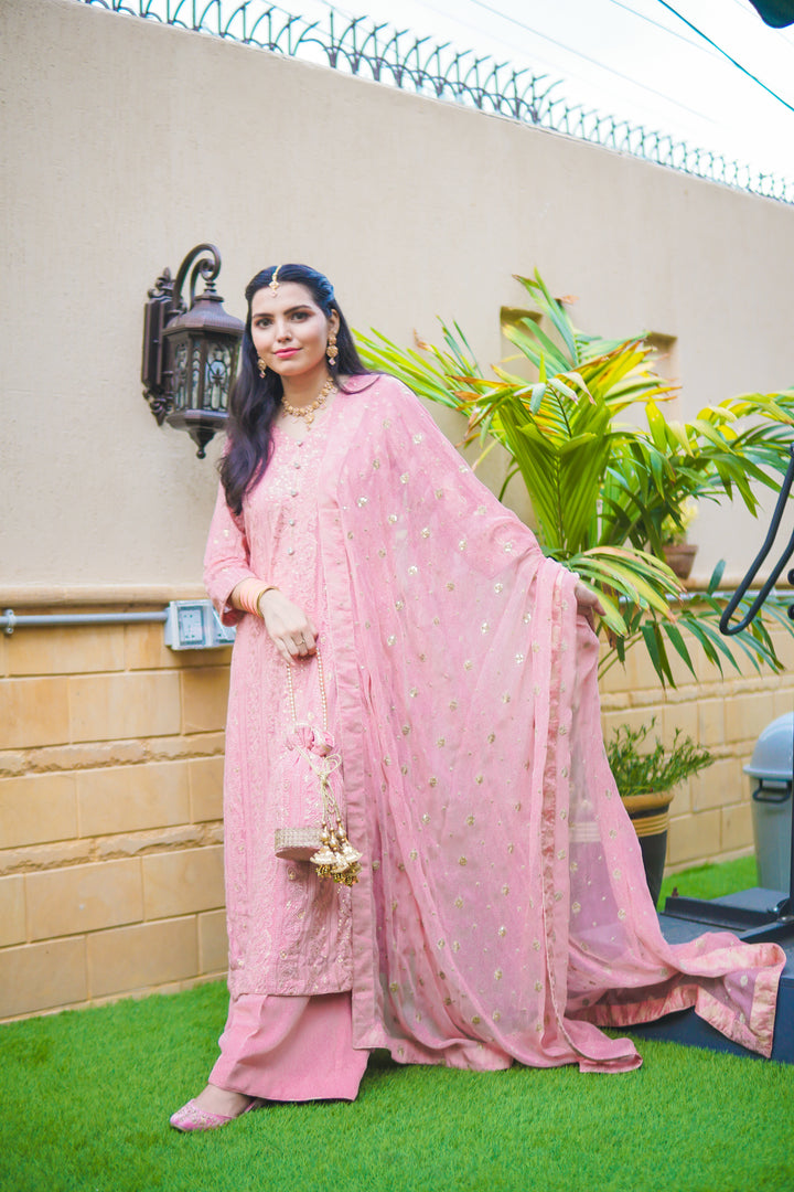 The threaded embroidery on the shirt & chiffon dupatta with golden embroidery enhances the regal charm of the attire.